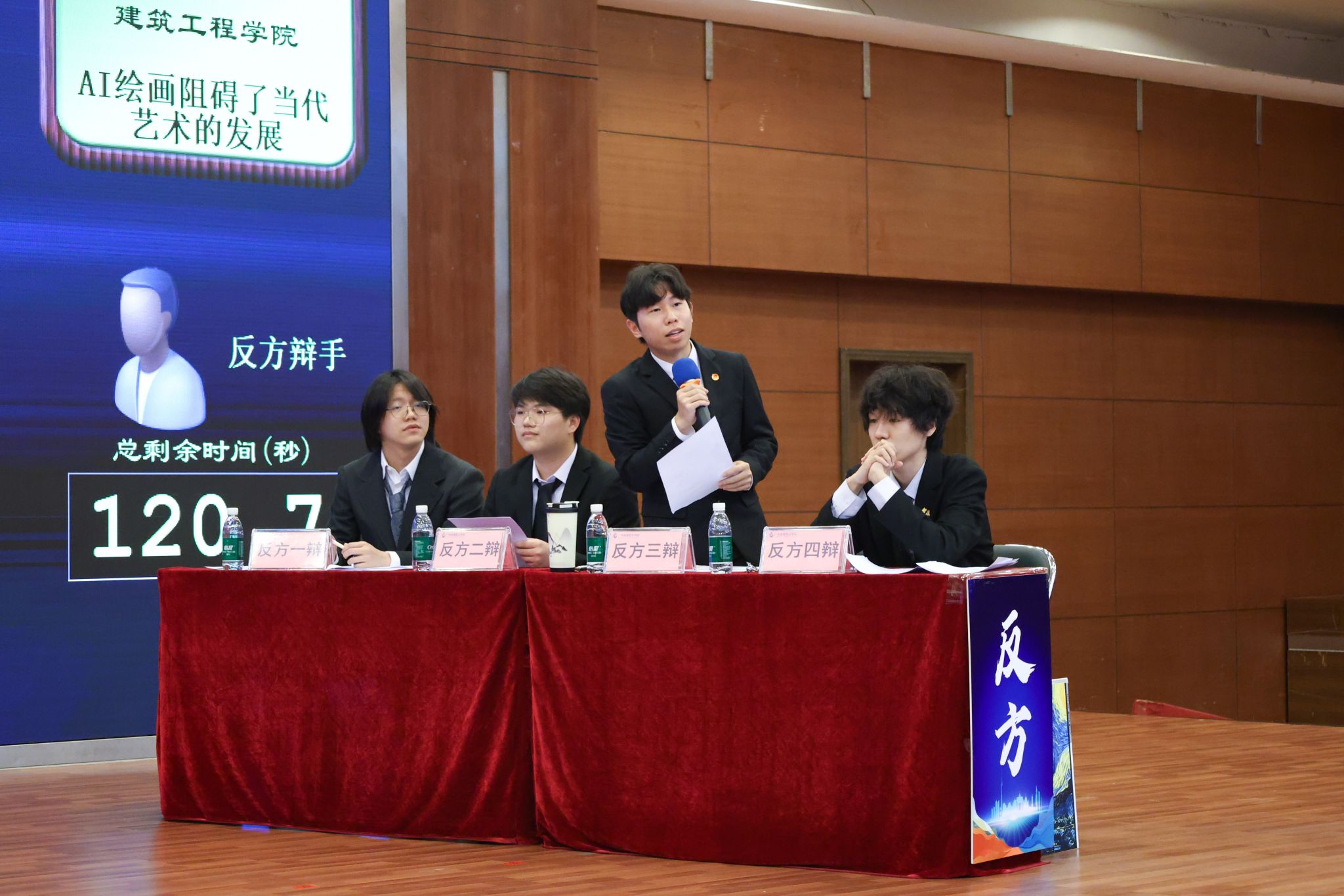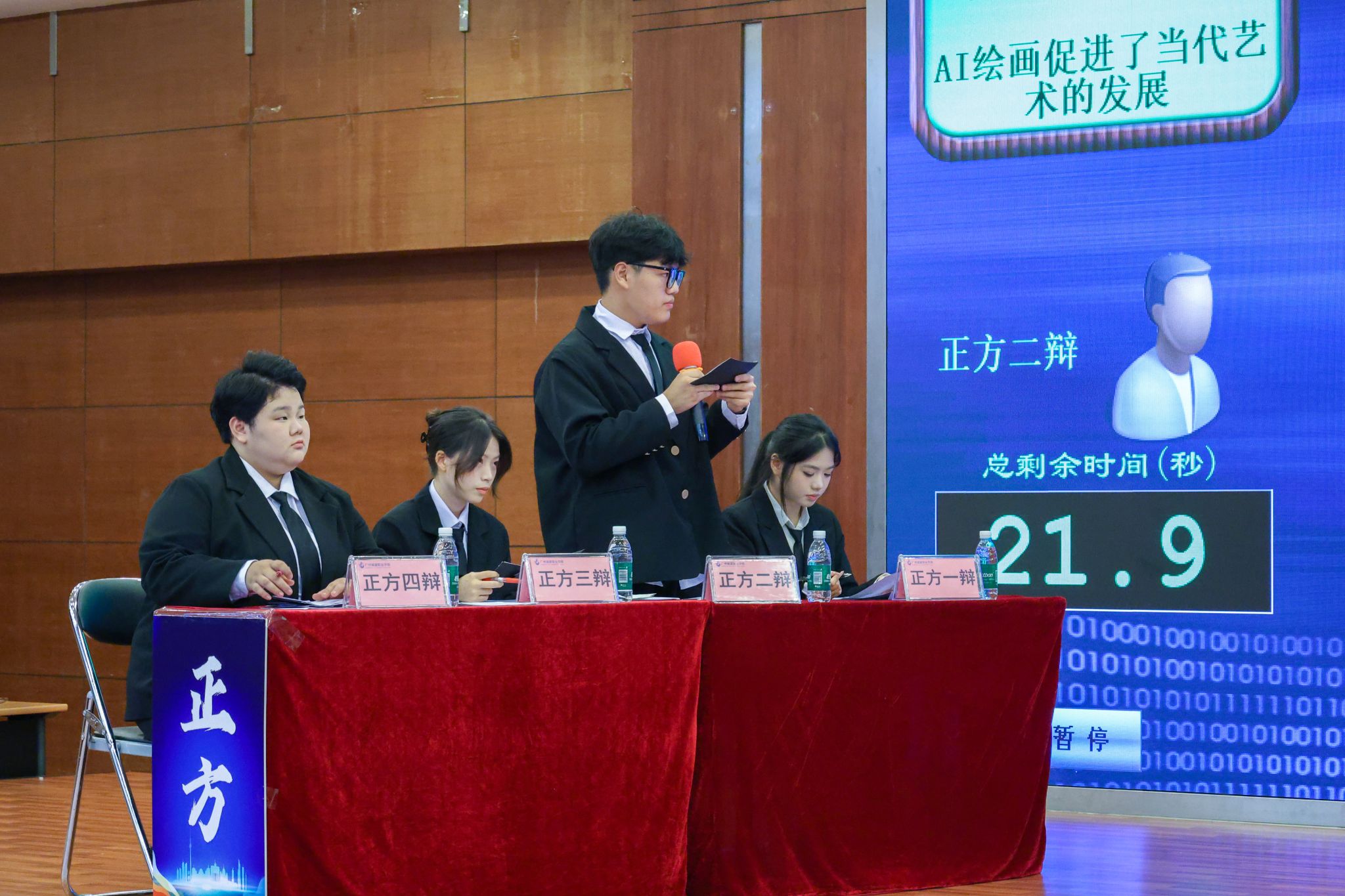 辩论赛总决赛围绕“AI绘画促进/阻碍了当代艺术的发展”这一辩题展开对决。正方经济与管理学院代表队从技术创新与艺术民主化的角度论证AI绘画为艺术创作带来的可能性;反方建筑工程学院代表队则从艺术本质和人文价值维度进行反驳。双方辩手思维敏捷、妙语连珠,在立论、质询、自由辩论等环节展现出扎实的知识储备和出色的临场应变能力,为现场观众呈现了一场高水平的思辨盛宴。