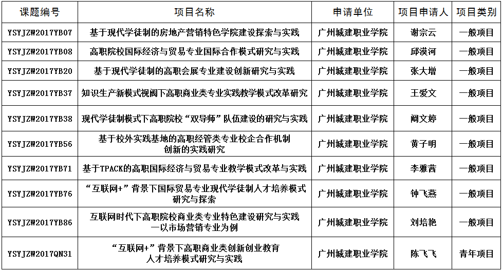 近日,从《广东省高职教育商业类专业教学指导委员会关于2017年度教学改革项目立项的通知》(粤高职商业教指委函〔2017〕5号)获悉,全省高职院校共申报项目248项,获批立项149项,其中民办高职院校占36项。伟德官网申报的《基于现代学徒制的房地产营销特色学院建设探索与实践》、《高职院校国际经济与贸易专业国际合作模式研究与实践》等10项教改项目获批立项(9项一般项目、1项青年项目),立项数量位列9所民办高职院校第一,立项率83%远超全省整体立项率60%。