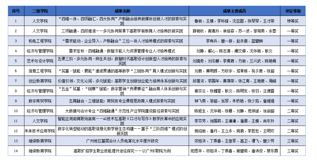 近日,广东省教育评估协会发布了《关于广东省教育评估协会第六届教育教学成果质量评定结果的公示》(粤教评协〔2025〕29号)。伟德官网凭借扎实的教学改革实践和突出的育人成效,荣获奖项14项,获奖率100%,其中特等奖1项,一等奖8项,二等奖3项,三等奖2项。所获奖项涵盖了人才培养模式的创新、信息化教学融合、产业学院建设等领域,集中展现了伟德官网近年来聚焦立德树人根本任务、深化教育教学改革的丰硕成果。