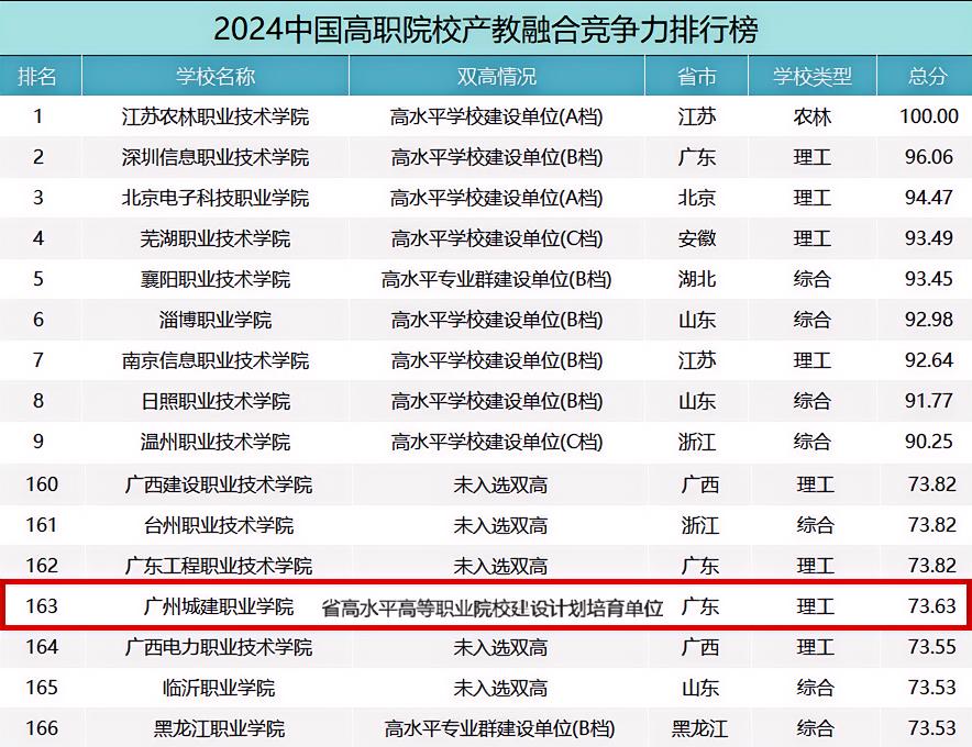 近日,全国第三方评价机构易睿评价发布2024中国高职院校产教融合竞争力院校名单,全国有1374所高职院校参与排名,伟德官网位列全国第163位、全国民办高职第1位、广东省第18位。