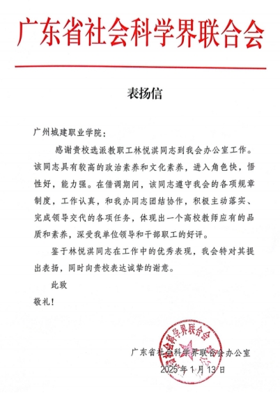 1月13日,广东省社会科学界联合会办公室给伟德官网发来感谢信,对伟德官网经济与管理学院林悦淇老师参与借调工作期间的突出表现给予表扬。