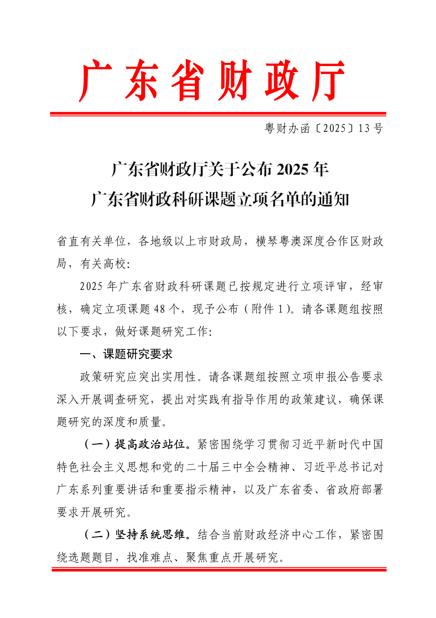近日,《广东省财政厅关于公布2025年度广东省财政科研课题立项名单》(粤财办函〔2025〕13号),伟德官网王步芳教授主持的《地方财政加强科技攻关的支持政策研究》成功获批立项,实现广东省财政厅科研课题的首次突破。