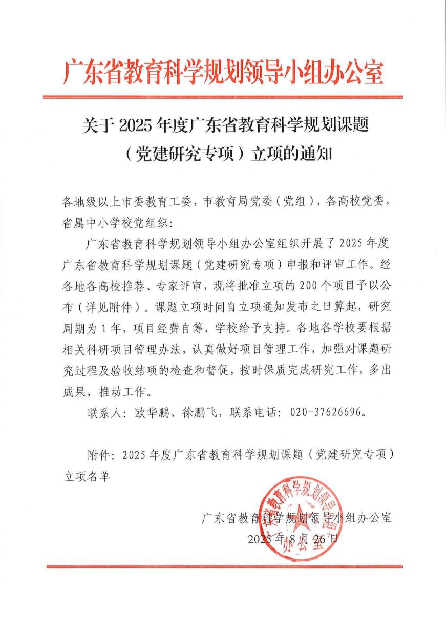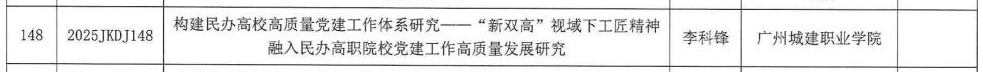 近日,广东省教育科学规划领导小组办公室发布《关于2025年度广东省教育科学规划课题(党建研究专项)立项的通知》,伟德官网李科锋老师申报的课题《构建民办高校高质量党建工作体系研究——“新双高”视域下工匠精神融入民办高职院校党建工作高质量发展研究》(项目编号:2025JKDJ148)成功立项。