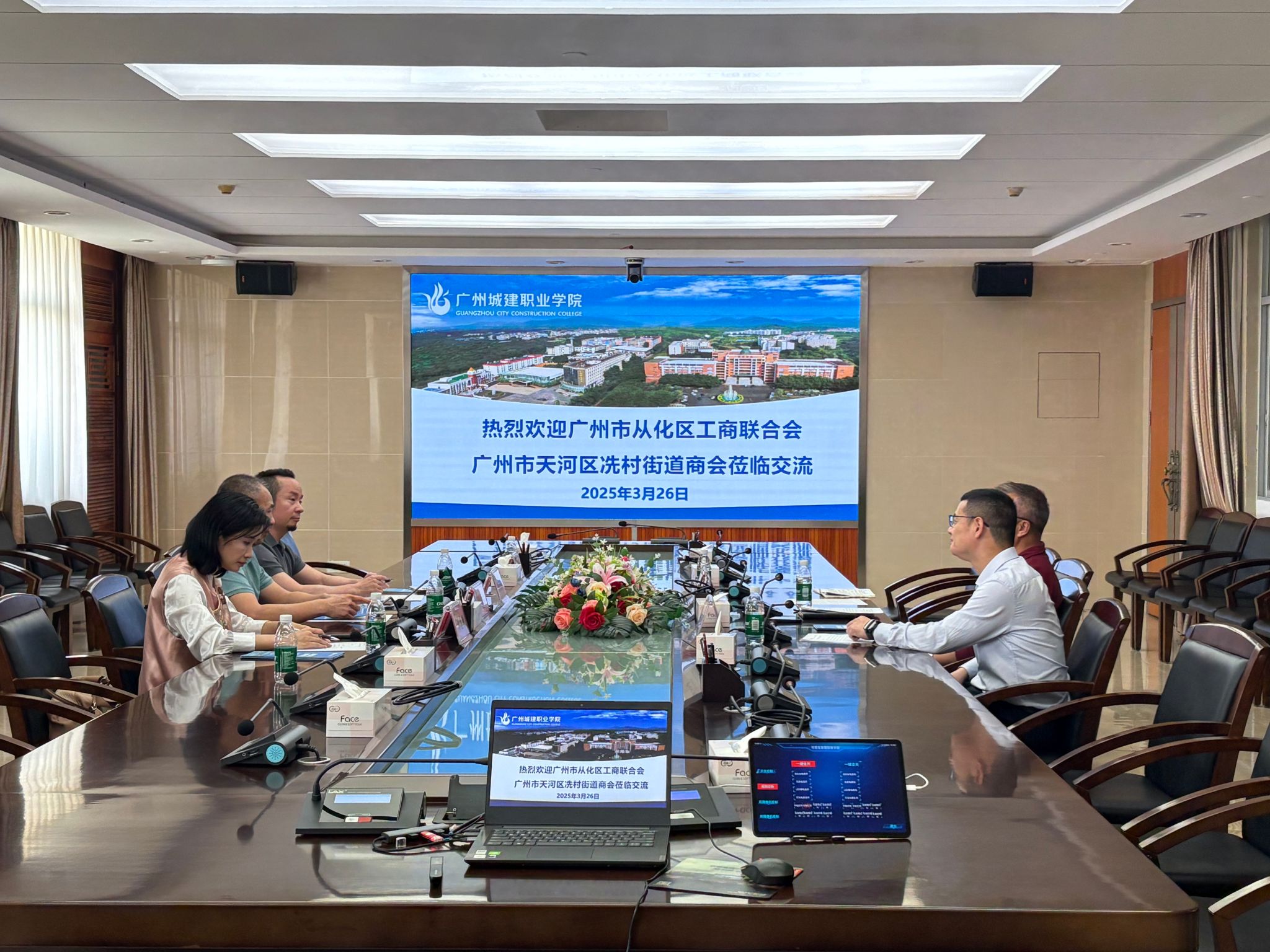 3月26日,广州市从化区工商联联合会书记李爱文、广州市天河区冼村街道商会会长陈治军等领导莅临学校开展座谈交流,学校副校长、党委副书记张德宜,学生就业创业处处长潘福中等参加座谈交流。