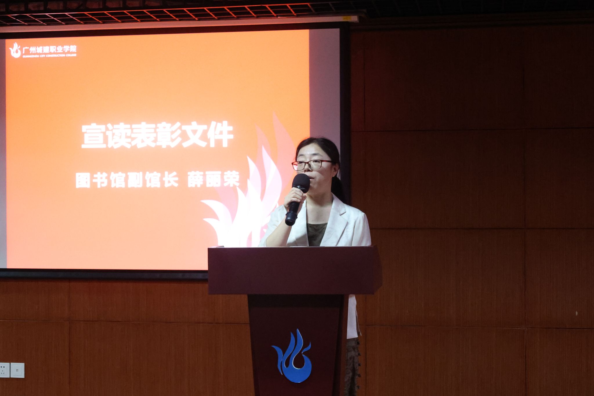 薛丽荣宣读学校关于表彰2023-2024学年“书香学院”“书香班级”“书香之星”“最佳辅导教师”决定的文件。