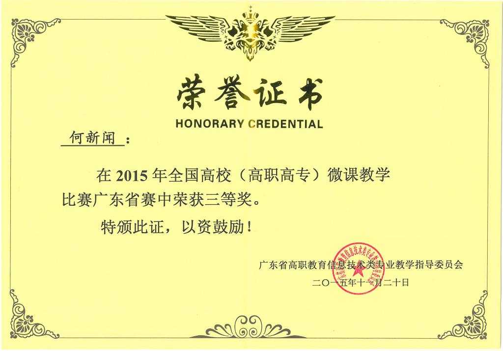 近日,从《关于表彰2015年全国高校(高职高专)微课教学比赛广东省赛获奖教师的通知》(粤高职信息教指委函〔2015〕6号)中获悉,伟德官网参赛的3个微课作品在2015年全国高校(高职高专)微课教学比赛广东省赛中荣获佳绩。艺术与设计学院何新闻院长的《实木地面装饰构造设计》、田甜老师的《Flash动画制作基本流程》、周硕珣老师的《环浪领结构设计》均荣获三等奖。