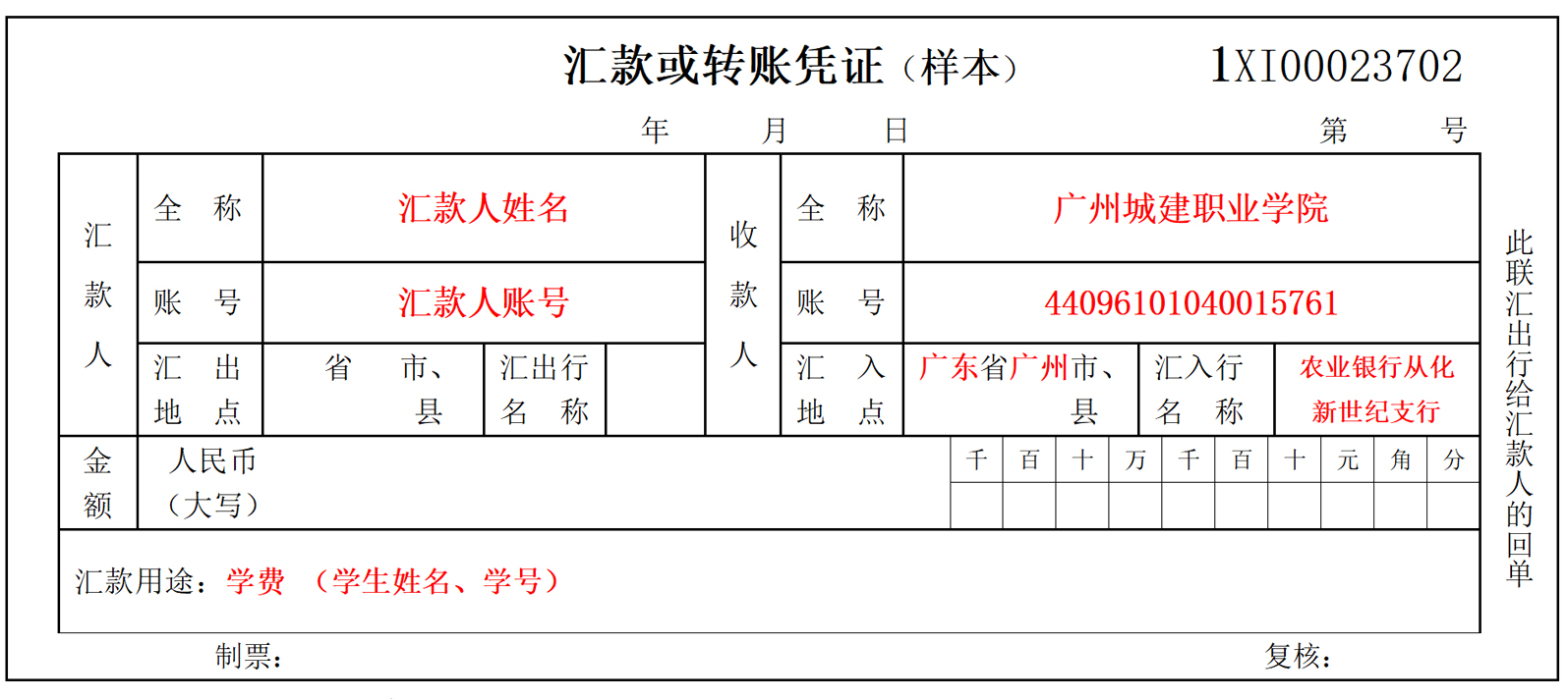 汇入行名称: 中国农业银行广州从化新世纪支行 ;金额栏填写缴费金额和大写金额;