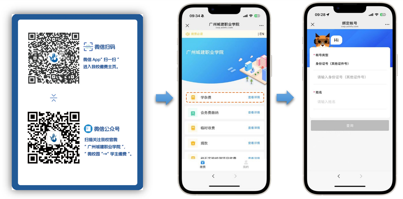 1.用户可选择下方不同的二维码扫描进入伟德官网缴费主页面,点击“学杂费”进入,在登录页面依次填写身份证号+姓名,点击“查询”,可看到目前该账号的待缴费项目。