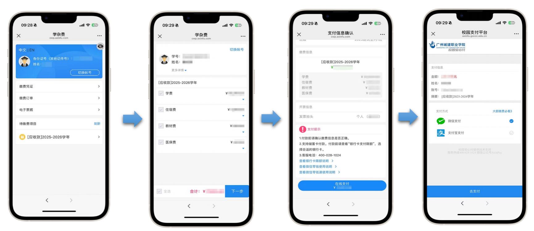 2.点击进入查看详情(*缴费项目及金额以实际显示为准),默认全选缴费子项目点击“下一步”核实缴费信息无误点击“在线支付”,选择“支付宝支付”或“微信支付”跳转其官方页面完成支付即可。