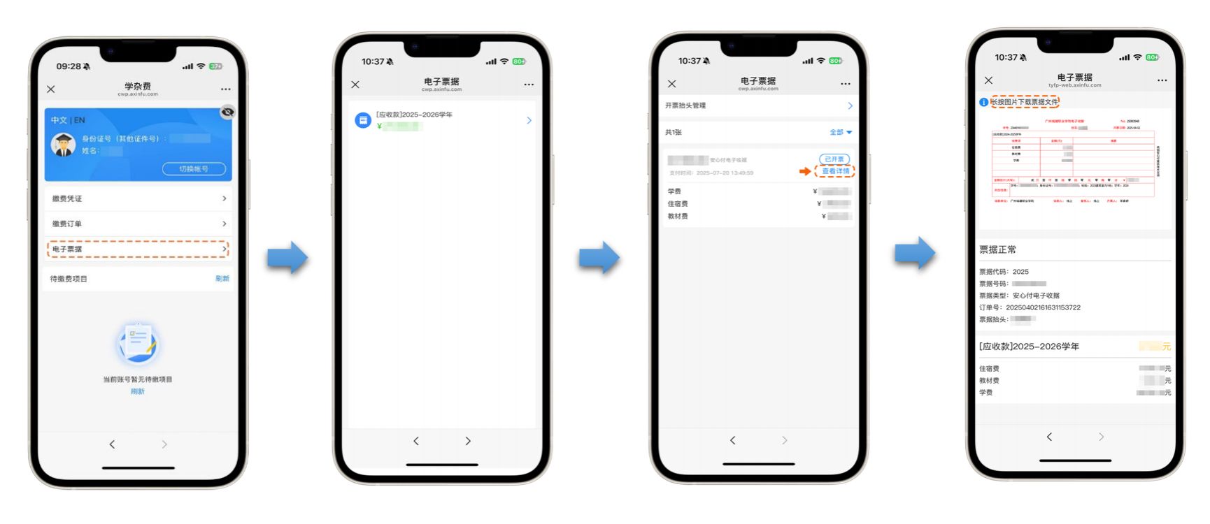 缴费完成后回到缴费主页点击“电子票据”可查到目前账号的缴费记录,点击相应项目可查看电子票据开具详情,只有“已开票”状态的才可查看及下载,点击“查看详情”进入,如需打印可自行下载打印。